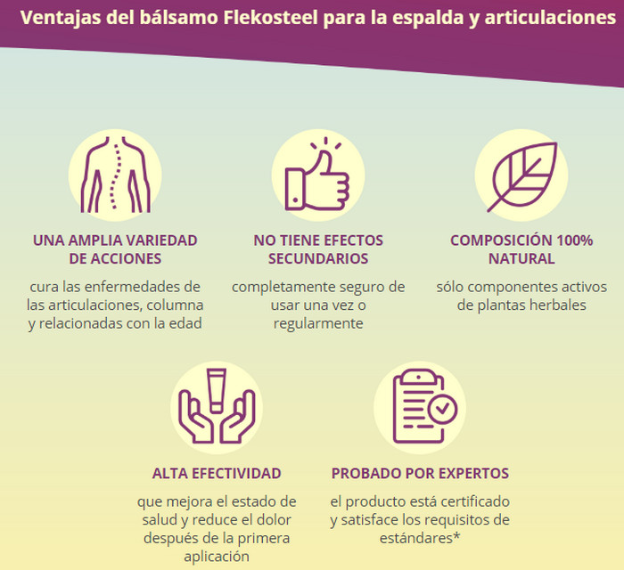 La medicina herbaria Flekosteel elimina el dolor y reduce el proceso inflamatorio. Flekosteel También es eficaz en el tratamiento del dolor de espalda y la artritis, ya que causa la degeneración del tejido del cartílago y estimula el metabolismo, contribuyendo a la restauración del cartílago en las articulaciones. Puede ver los efectos positivos después del primer uso. Con el uso regular, la artritis y la columna saldrán de la historia.
